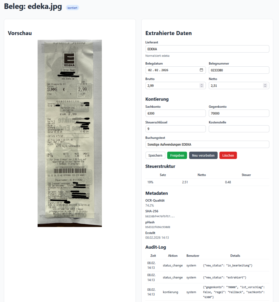 Sie laden Belege und Kassenbons einfach per Drag and Drop in die Cloud hoch, als Foto oder PDF. Unsere OCR liest die Dokumente automatisch aus und extrahiert alle relevanten Daten wie Lieferant, Belegdatum, Belegnummer, Brutto, Netto sowie die Steuerinformationen. Anschließend sehen Sie die erkannten Werte in einer klaren Übersicht, können sie prüfen, bei Bedarf korrigieren und mit einem Klick freigeben. Erst nach Ihrer Freigabe werden die Daten für den Import in Ihr Buchhaltungssystem aufbereitet.